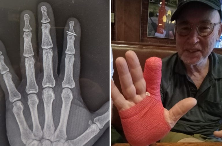 “Uh, you’re looking at the x-ray, right?” I offer. “Do whatever you think is best.” In my mind amputation is still on the table. The nurse no longer squeezes my good hand. I’m left to face my fate.
